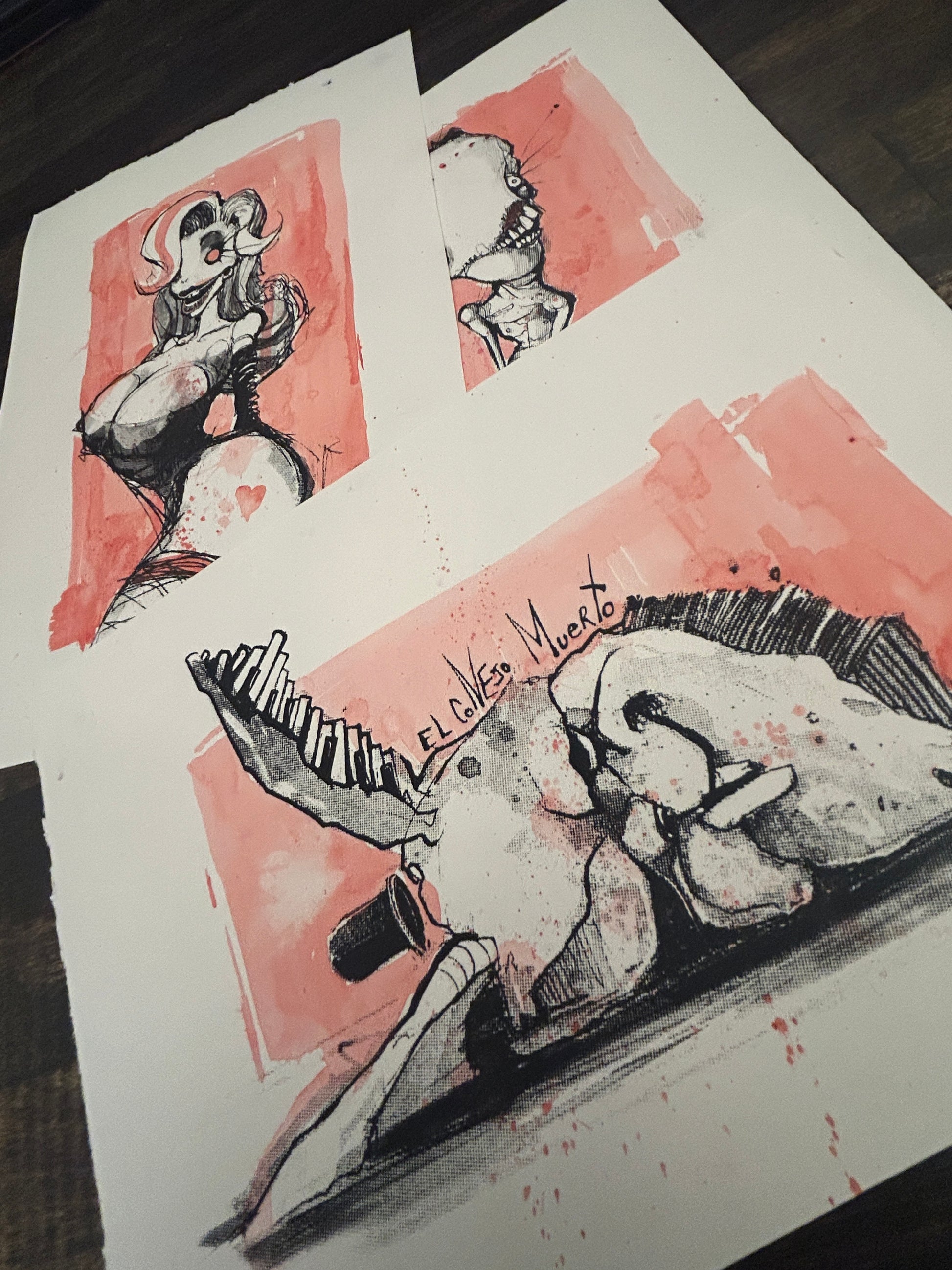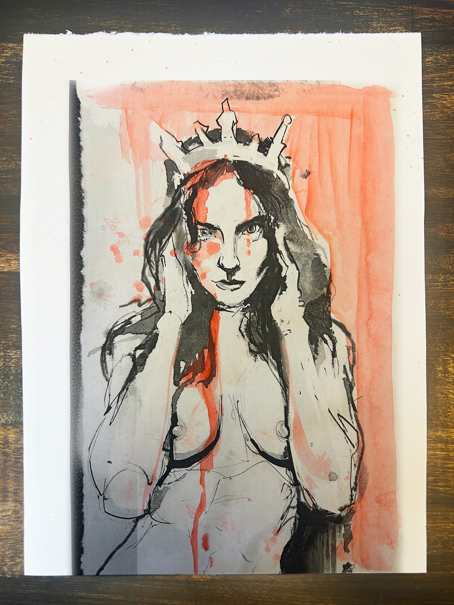 Fab pulls her in layered black halftones, raw and unapologetic, then washes each print in hand-painted scarlet — bleeding through the paper, shifting with every pass. The drip down her center isn’t decoration. It’s consequence.