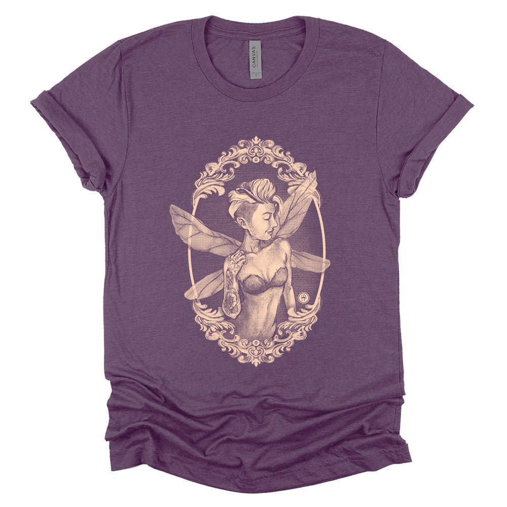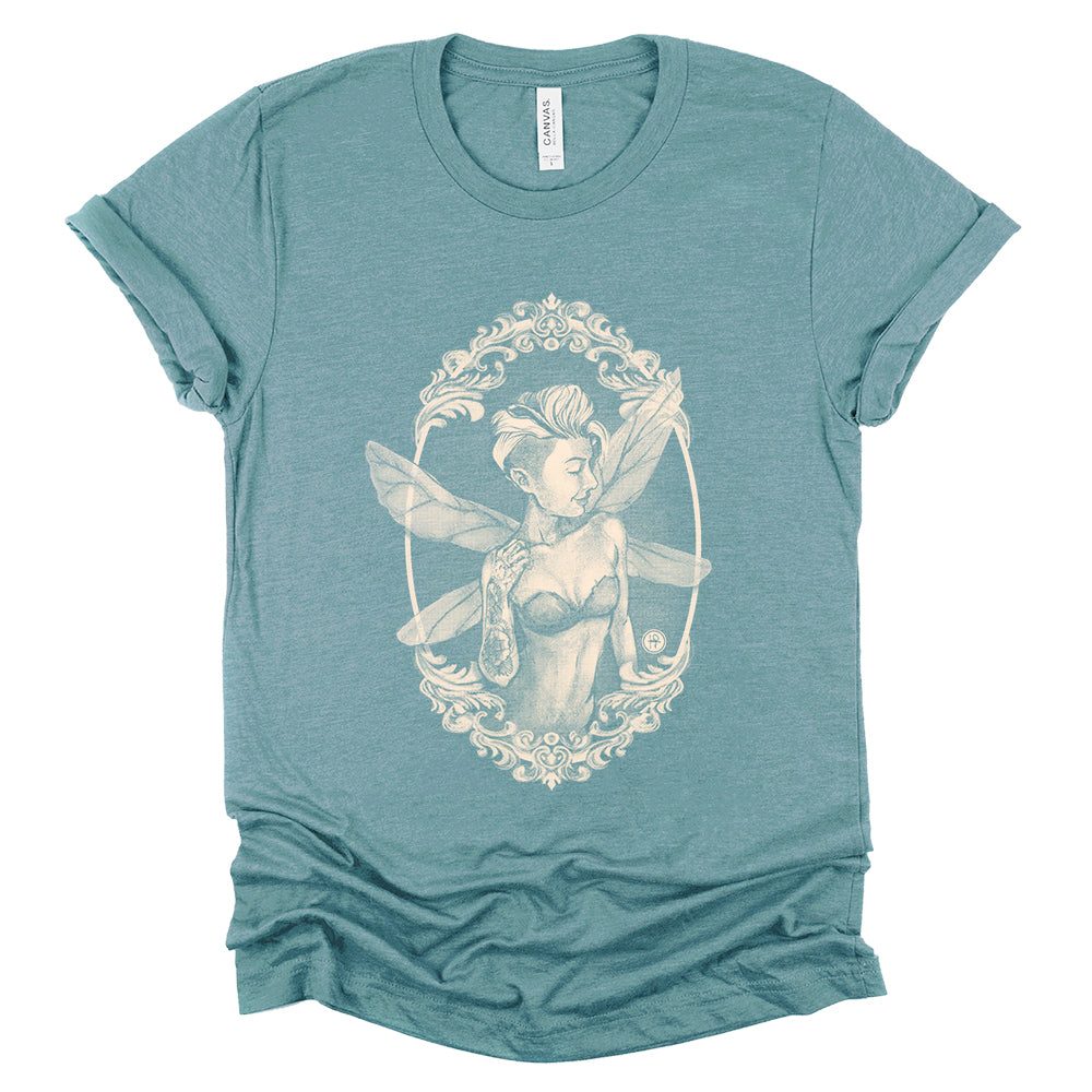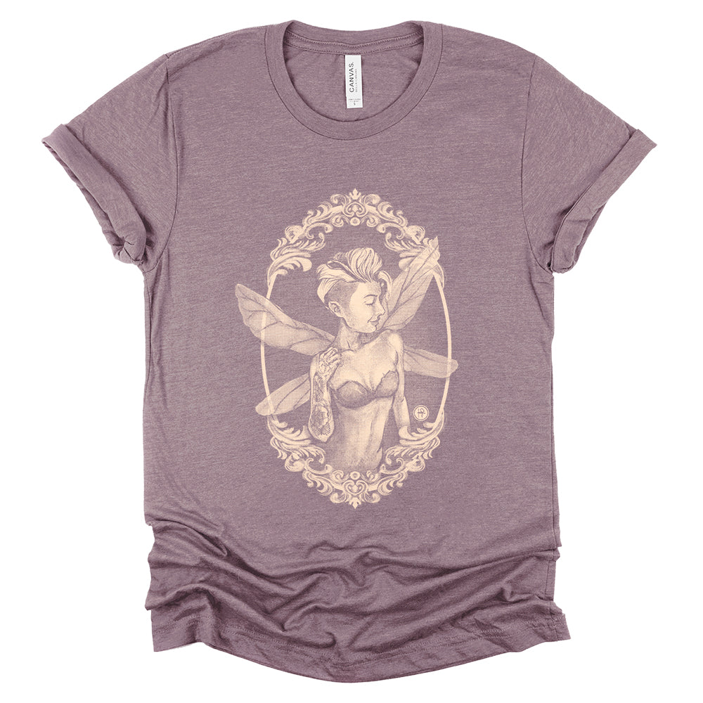 Since Fab's usual style steers clear of "cute," this "Fairy in the Mirror: Reflections of Modern Enchantment" design offers a modern, sexy fairy with tattoos and a pixie haircut. She gazes into a Victorian-style mirror, framed to perfection. Executed with delicate shading and minimal line work, the piece achieves a softer, more realistic feel.