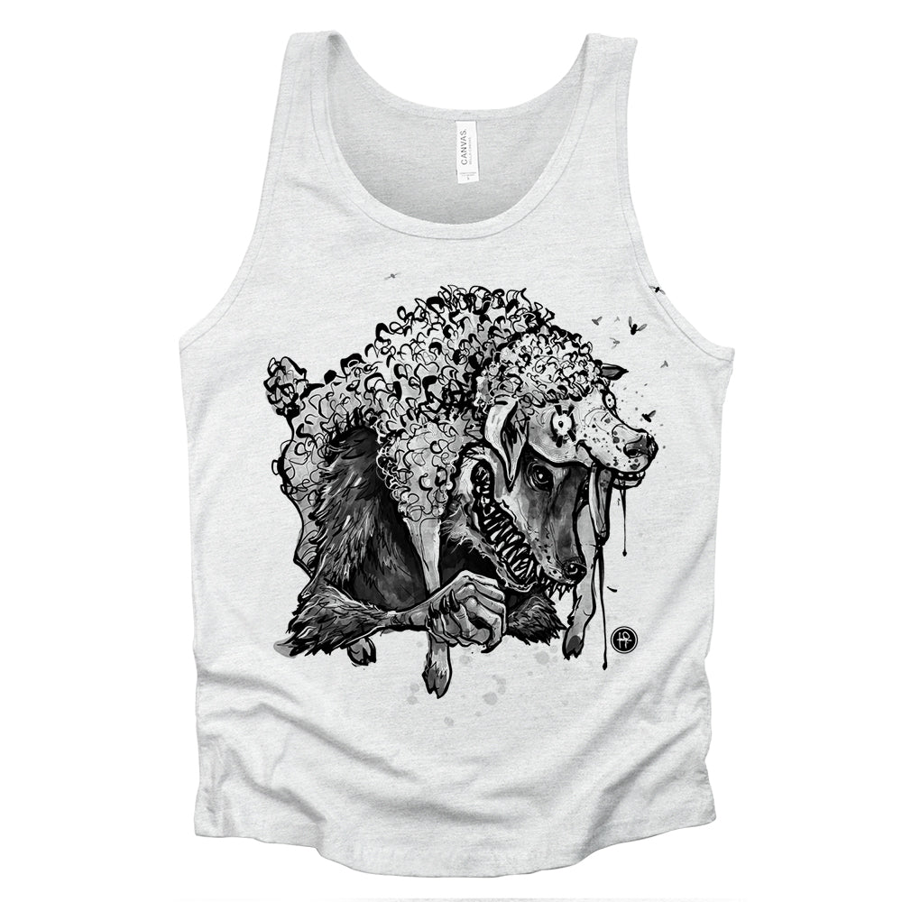 Challenge perceptions with our "Trust No One: Deceptive Disguise" print, featuring a wolf cunningly disguised in a rotting sheep carcass. This design serves as a stark reminder to remain vigilant and skeptical in a world where appearances can be deceiving. Many of Fab's ideas start with initially unsettling subject matter, which later evolves into more marketable designs—because ultimately, our customers have to wear these pieces.