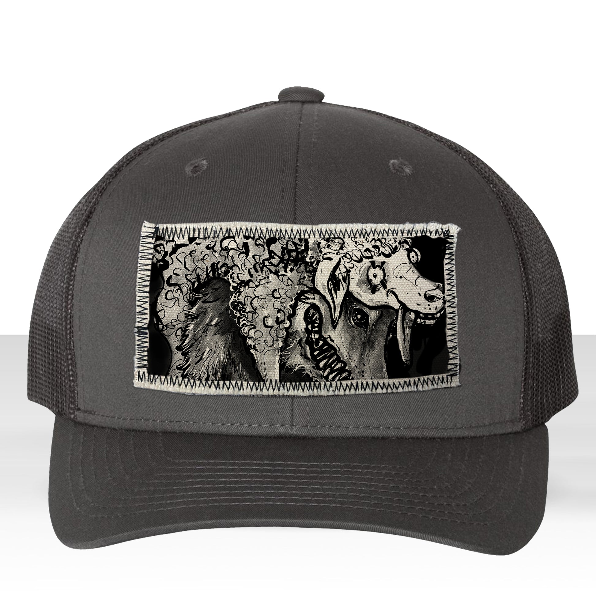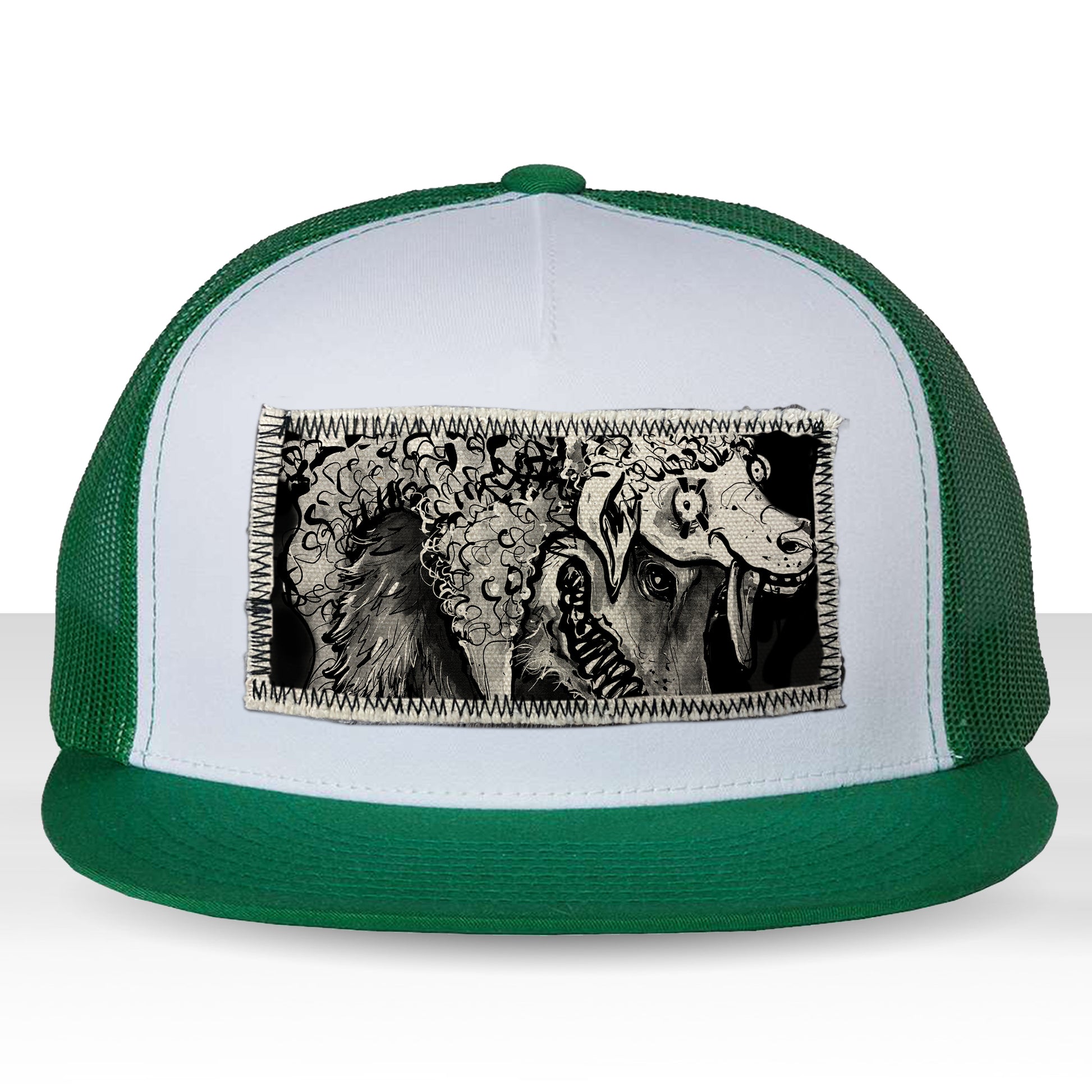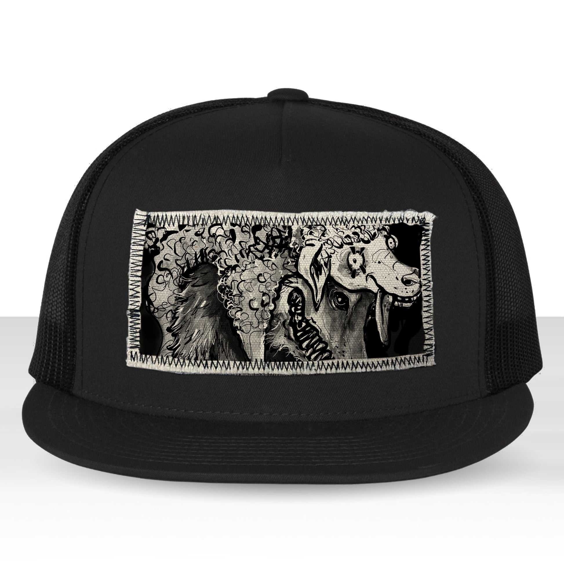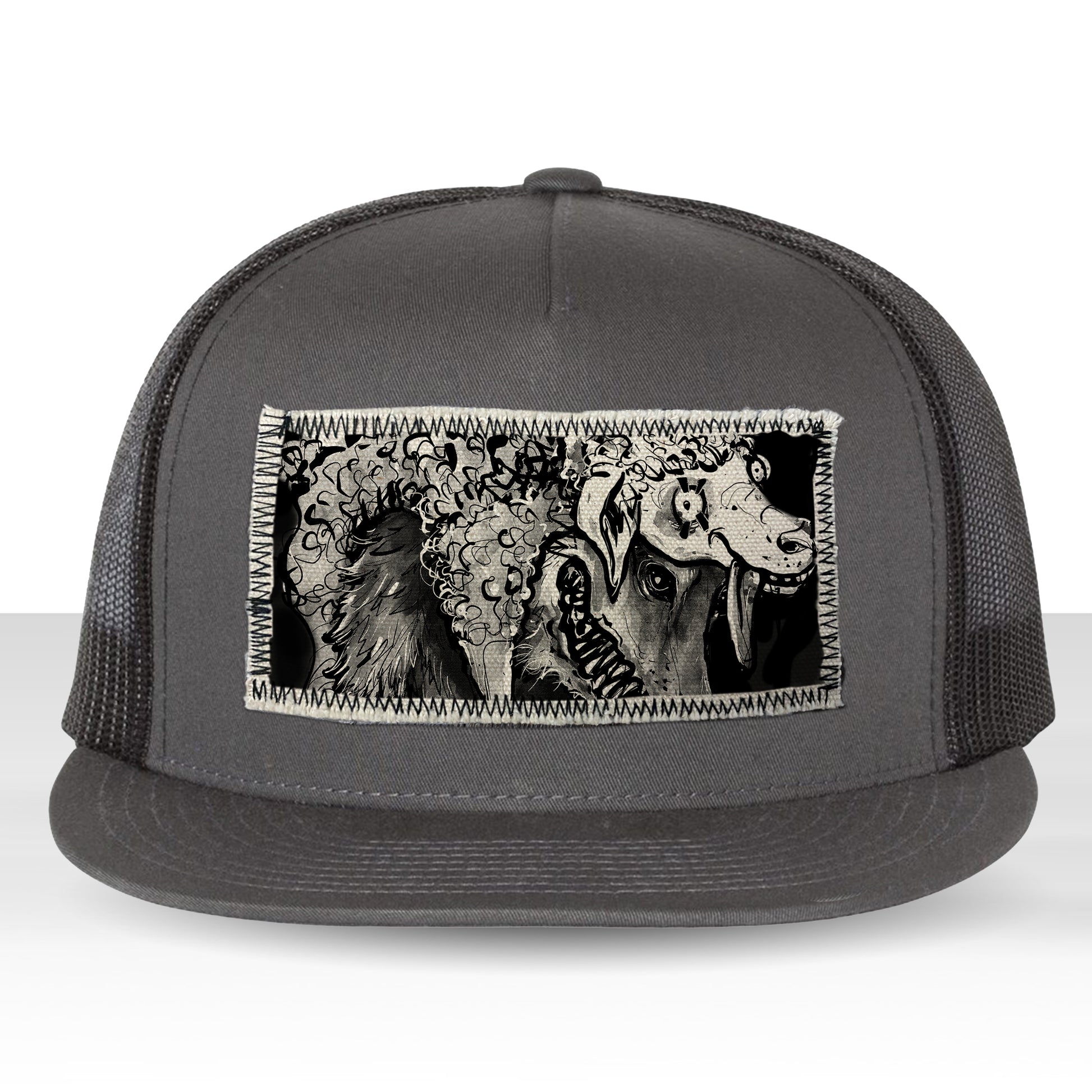 We meticulously hand-cut and stitch each patch before screen printing with water-based inks. For our hats, we use YP Classics - Five-Panel Classic Trucker for flat bills with a high profile, and YP Classics - Six-Panel Trucker Cap for curved bills with a mid profile. Both styles feature a 65/35 polyester/cotton blend, a mesh back, and a snapback closure. These trucker hats showcase FabCreates' signature gritty, imperfect style.