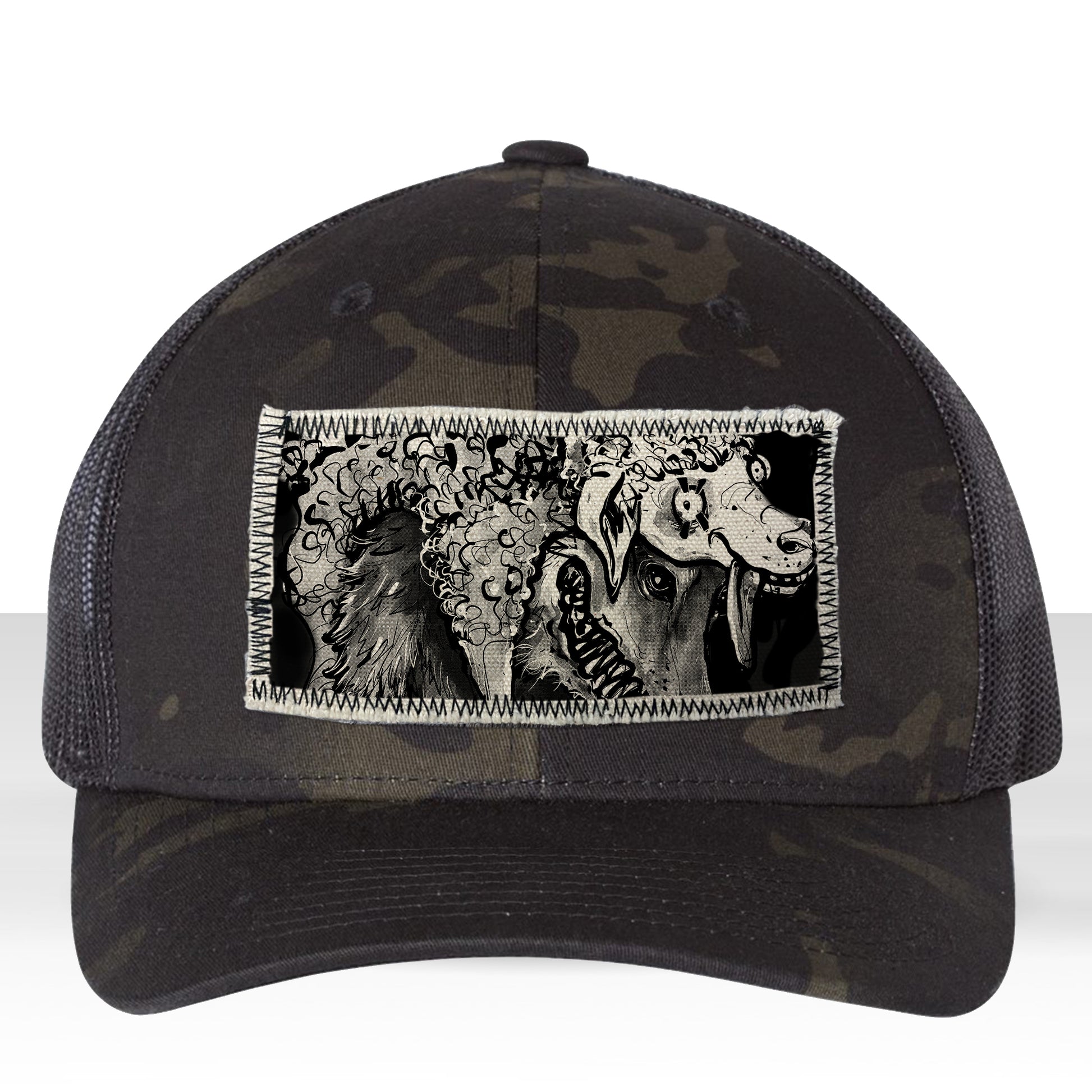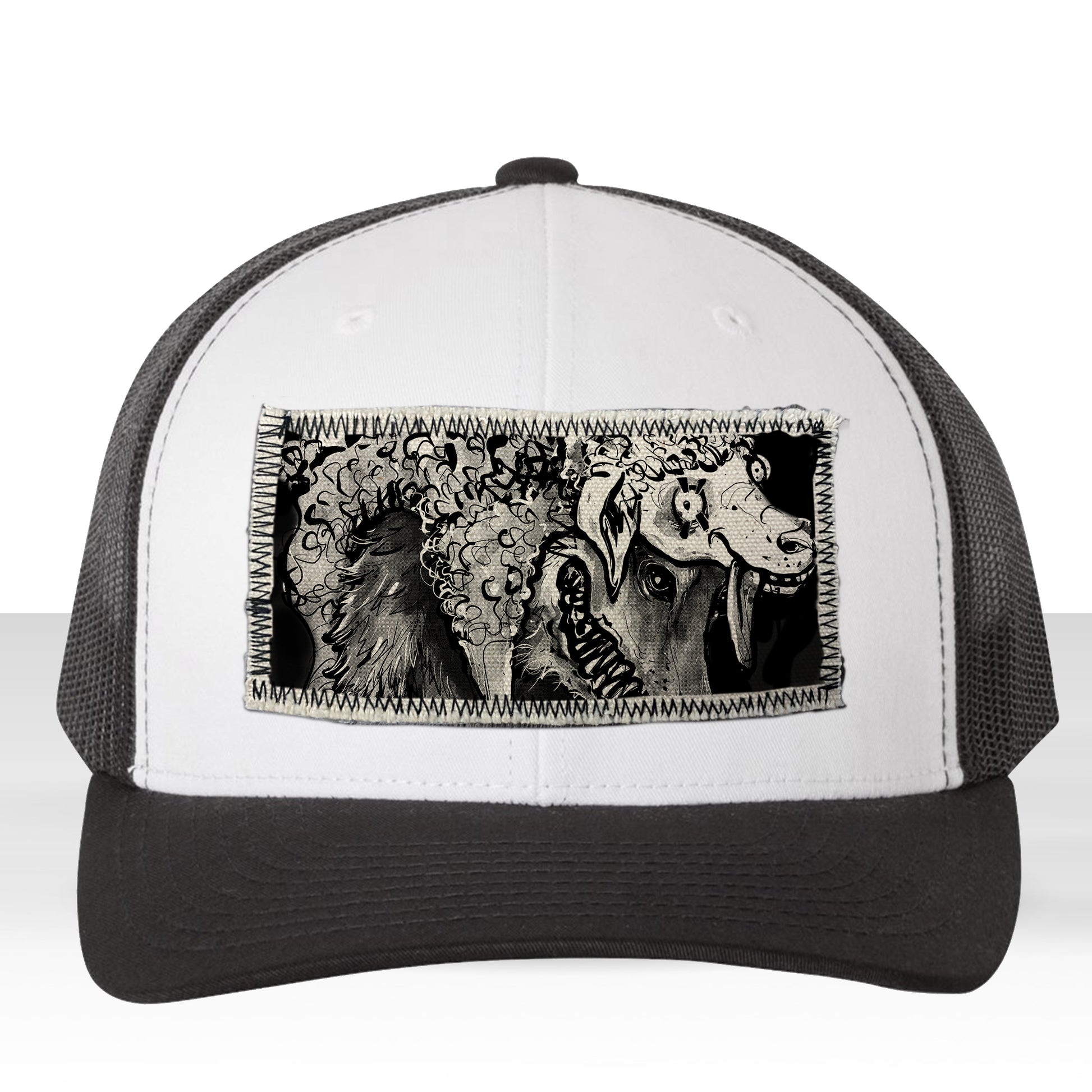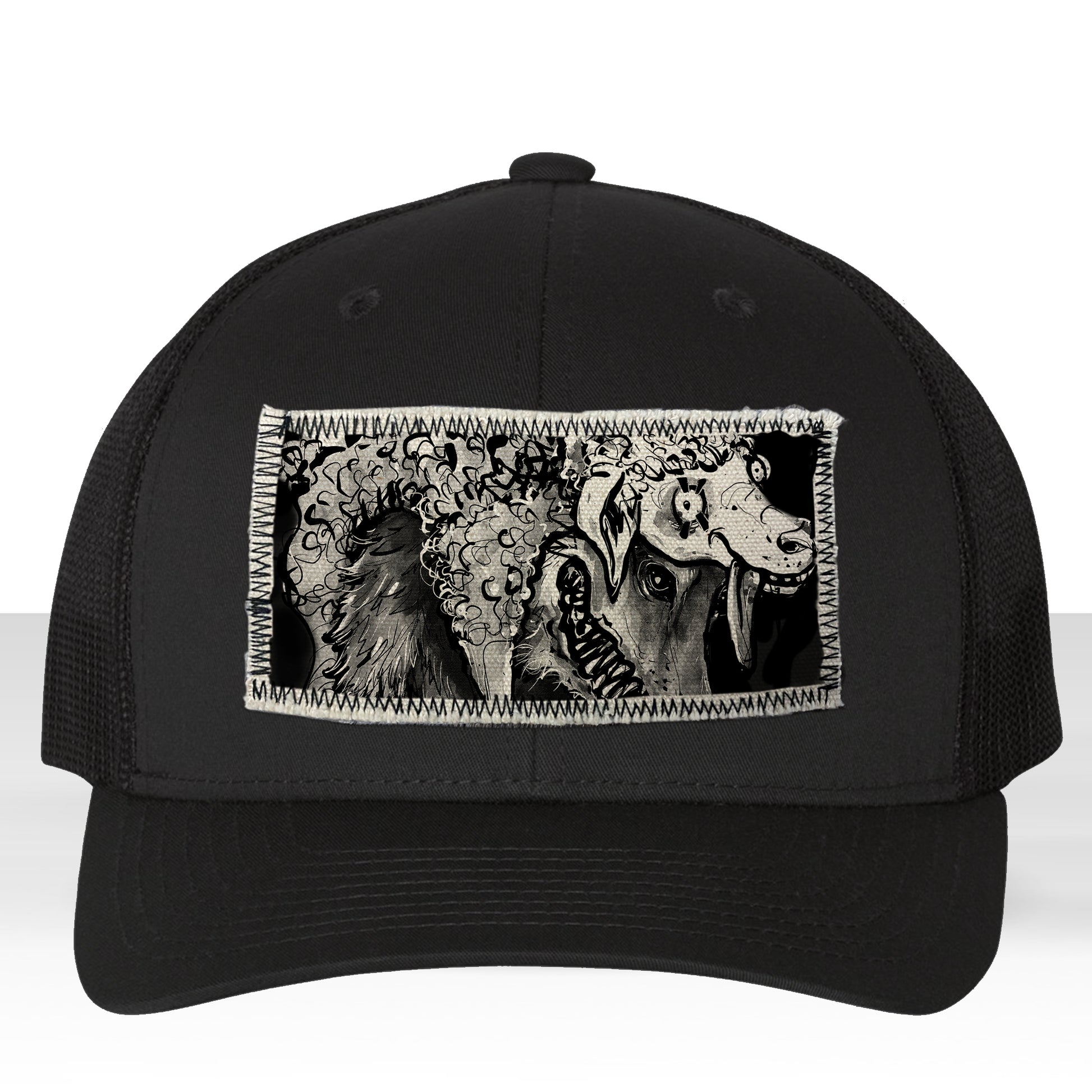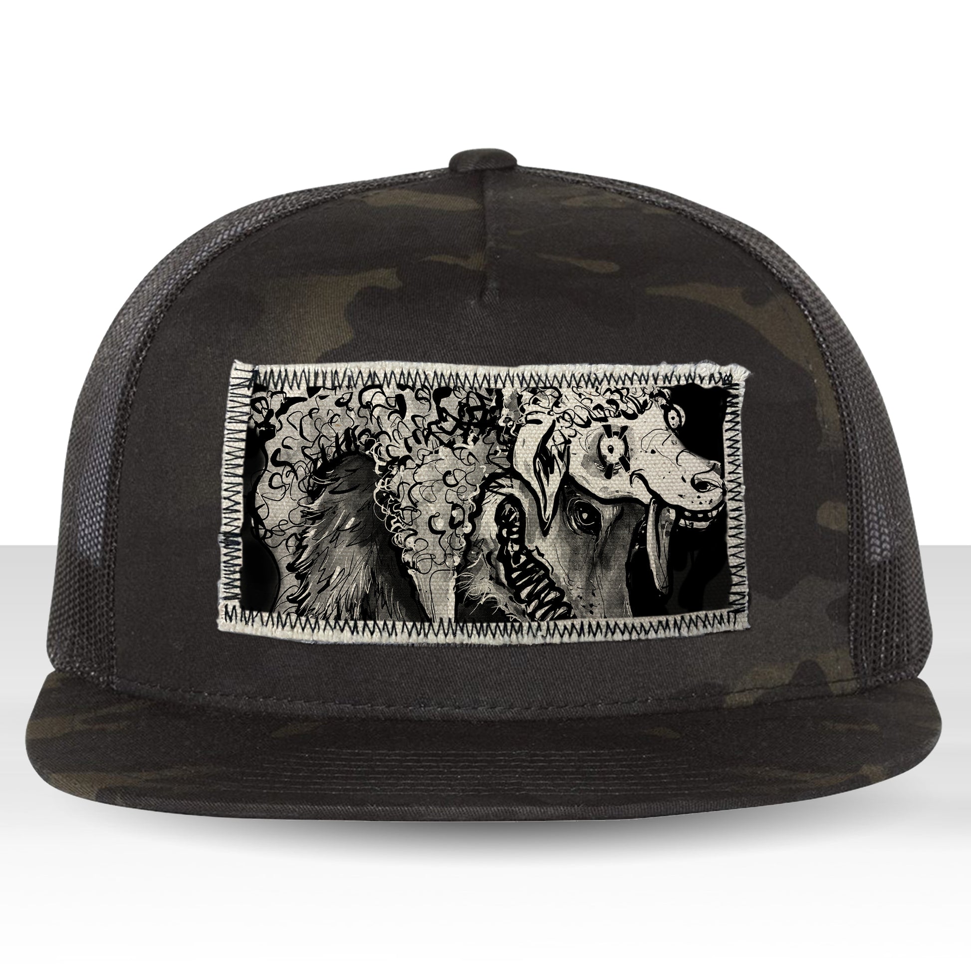 We meticulously hand-cut and stitch each patch before screen printing with water-based inks. For our hats, we use YP Classics - Five-Panel Classic Trucker for flat bills with a high profile, and YP Classics - Six-Panel Trucker Cap for curved bills with a mid profile. Both styles feature a 65/35 polyester/cotton blend, a mesh back, and a snapback closure. These trucker hats showcase FabCreates' signature gritty, imperfect style.