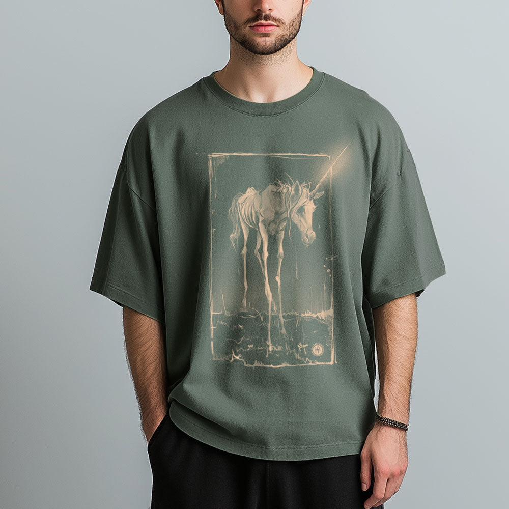 Bid farewell to an era of enchantment with our "Unicorn's Last Light: Farewell to Magic" print. As time dwindles for this magical creature, it marks the end of innocence and the fading of mystical realms, reminiscent of the passing of childhood. Fab rendered this piece using white charcoal and pencil-effect brushes, ensuring it stands out against dark garments with its fading glow effect. Dali's influence is evident in this artwork, as one of Fab's greatest inspirations shines through.