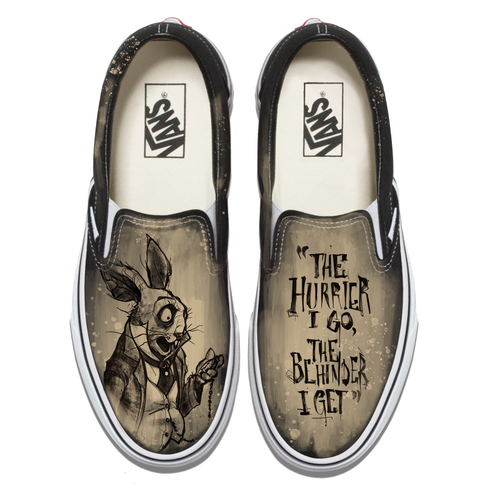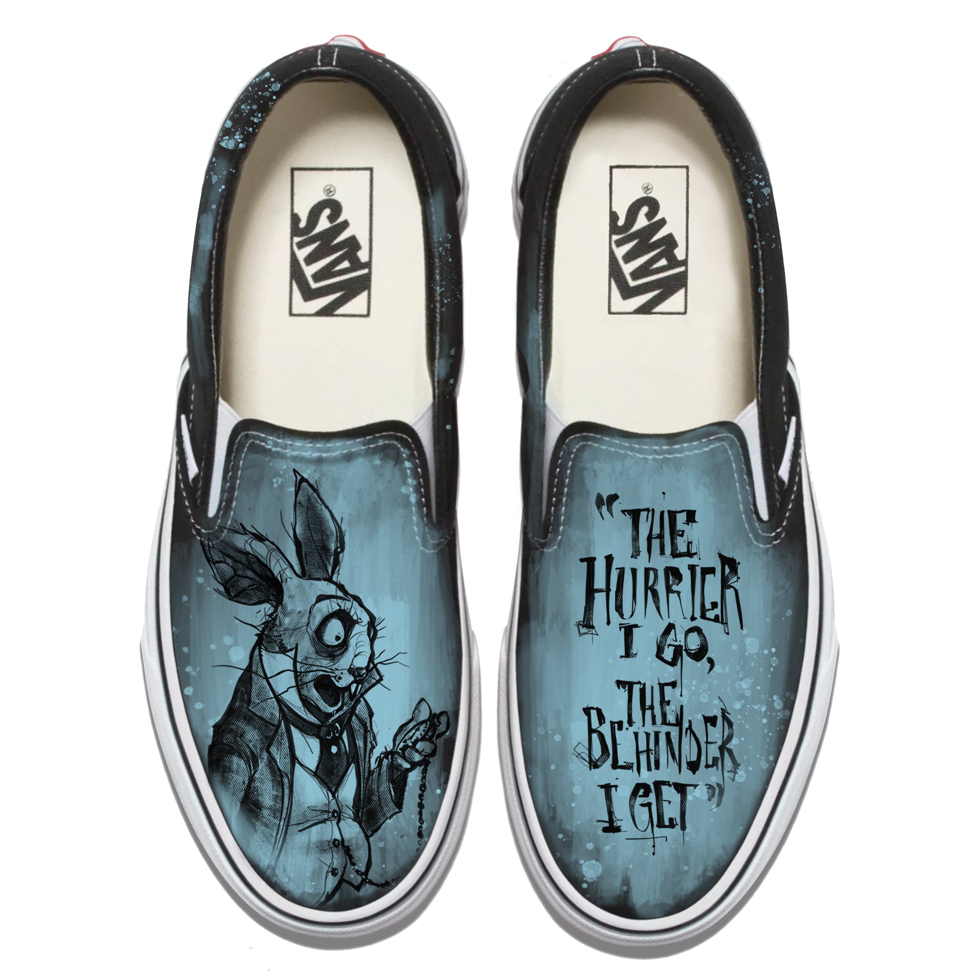 White Rabbit Quote: Timeless Paranoia Vans Slip ons