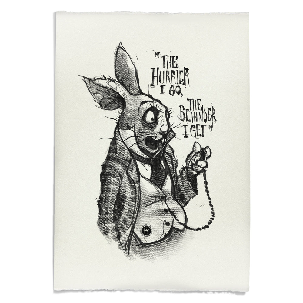 Capture the essence of Lewis Carroll's iconic tale with our "White Rabbit Quote: Timeless Paranoia" print. Featuring the classic quote "The hurrier I go, the behinder I get," this design embodies the whimsical paranoia of the perpetually late rabbit. Rendered with bold thick line work and gritty shadows, it evokes a sense of urgency and whimsy.